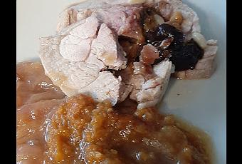 Estos redondos de pollo suelen prepararlos en las pollerías. En este caso está relleno de frutos secos y ciruelas. Pero también se puede comprar el pollo deshuesado y rellenarlo en casa al gusto.