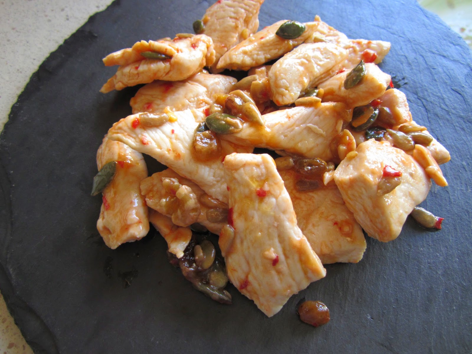 Vamos a cortarlas a pedacitos, de bocado.Lo doramos a fuego fuerte y antes de que termine de hacerse le bajamos el fuego.Añadimos una cucharada de pasta de Chile GOURMET GARDEN, un par de cucharadas de mezcla de frutos secos para ensalada (pipas de calabaza, nueces, pasas....) y una cucharada de ajo GOURMET GARDEN.