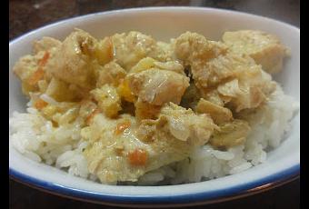 Picamos el ajo, la cebolla y los tomates. Salteamos el ajo en una sartén, con un chorrito de aceite, junto con el jengibre. Añadimos la cebolla y removemos. Cuando empiece a dorarse, agregamos los tomates y dejamos que se cocinen durante 2-3 minutos.Vertemos las especies, la sal y, una cucharadita de la tikka massala si tenemos. Añadimos la leche de coco y el pollo troceado.Dejamos durante 5 minutos. Apagamos el fuego.Podemos acompañarlo de un arroz basmati que elaboraremos siguiendo las instrucciones del fabricante o con otra receta del blog, arroz aromatizado con leche de coco
