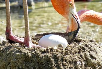 Los flamencos (Phoenicopterus ruber) comienzan su cortejo con una especie de danza donde primero se señalan con la cabeza y después se saludan con las alas y una vez establecida la pareja, que puede variar de una estación reproductora a otra (incluso en la misma si se malogra una primera puesta), construyen un nido. En los flamencos, los vínculos de pareja no son tan fuertes como en otros pájaros que mantienen su pareja incluso durante toda la vida.Los nidos son montículos de barro que se elevan del suelo hasta 30 centímetros para evitar las inundaciones y el intenso calor que se concentra en el suelo. En su construcción participan tanto el macho como la hembra. Una vez construido, alberga un único huevo blanco mate que se encargan de incubar ambos progenitores durante 28 - 30 días en turnos durante períodos de 2 a 4 días cada uno. Lo empollan con las patas dobladas debajo del cuerpo y nunca dejándolas colgar del nido.