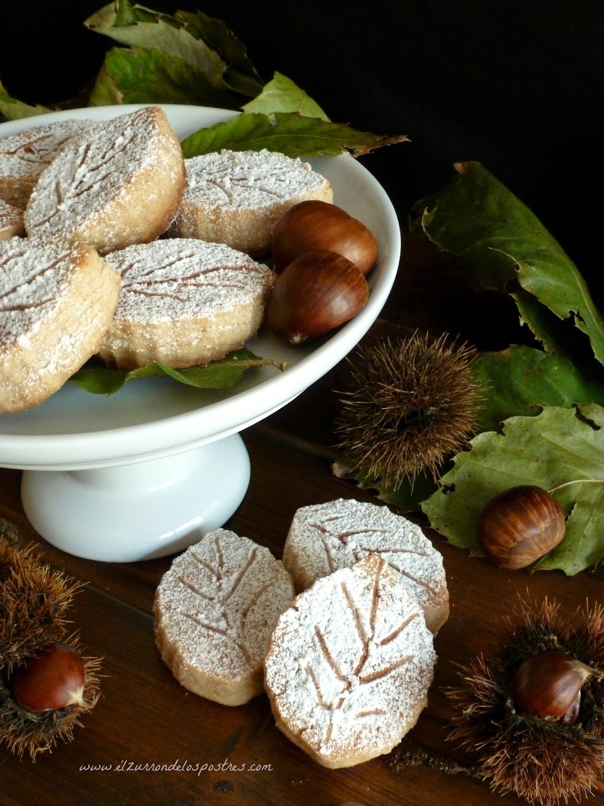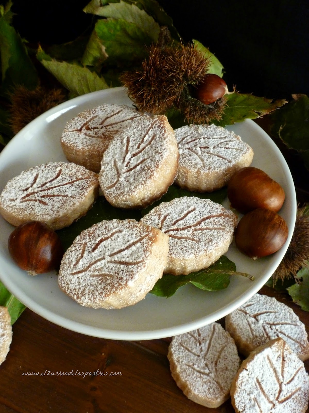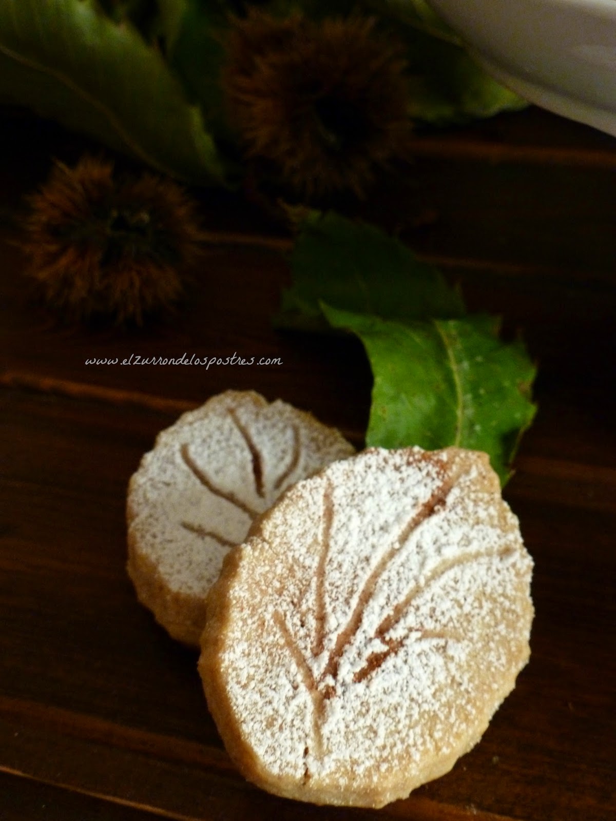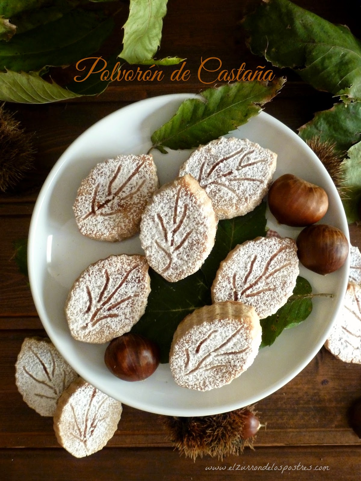 Canela en polvo y azúcar glas para espolvorear por encima.PREPARACIÓNTostamos ligeramente la harina con la almendra en el horno. Dejamos enfriar.En un bol ponemos la manteca de cerdo que deberá estar a punto pomada. Le añadimos la crema de castaña, las especias y el azúcar glas. Batimos hasta que esté una crema homogénea. Le añadimos la harina con la almendra integrándola bien. Formamos un rulo, lo envolvemos en papel film y lo guardamos en la nevera como mínimo 4 horas o de un día para otro.Precalentamos el horno a 180ºCFormamos los polvorones de la forma deseada, en mi caso hice hojas, los colocamos sobre una bandeja forrada con papel vegetal y horneamos unos 15 minutos.No manipular hasta que no estén totalmente fríos.Espolvoreamos con canela y luego con azúcar glas, hacemos unos dibujos.
