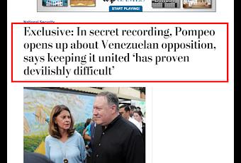 El secretario de Estado de EE.UU., Mike Pompeo, admitió que "el dilema" de EE.UU. de "mantener unida a la oposición [venezolana] resultó ser diabólicamente difícil", según un audio obtenido por The Washington Post.De acuerdo al rotativo estadounidense, el funcionario detalló que en la oposición de Venezuela hay "más de cuarenta personas" que se creen "legítimas" sucesoras del presidente Nicolás Maduro, en un hipotético escenario de salida del poder del mandatario venezolano.