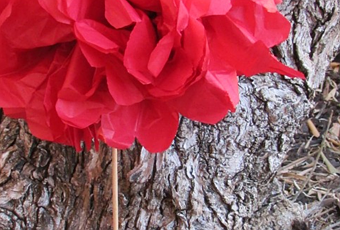 Doblamos las hojas de papel seda como un acordeón y las atas por el medio con la cinta