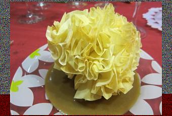 - Doblar las hojas en forma de acordeón hasta que quede una sola tira, que doblaremos por la mitad y la ataremos por debajo con un trozo de hilo.