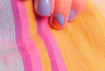 Y en el anular y pulgar, marqué en primer lugar la mitad de cada uña con un fucsia intenso, y una vez seco apliqué finas líneas de los mismos colorines del pañuelo. Finalmente, añadí 3 apliques al bies en cada uña, y listo.
