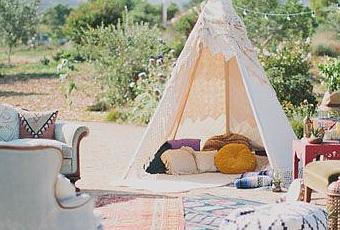 Pero si hay algo que me ha encantado, a nosotras que nos gusta tanto mezclar estilos (sí, lo sé, lo shabby chic nos vuelve locas), es acoplar un tipi en una zona de mobiliario con butacas antiguas, baúles, mesitas…para hacer un rincón o área de descanso en el cóctel.