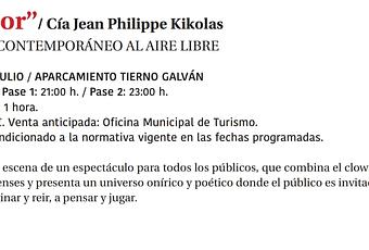 El ciclo de circo Sin Red levantará el telón de su quinta edición este fin de semana con la representación de la obra “Calor” de la Compañía Jean Philippe Kikolas los días 2 y 3 de julio a las 21:00 y las 23:00 en el aparcamiento de Tierno Galván. Las entradas ya se pueden adquirir al precio de 3 € en la Oficina Municipal de Turismo.