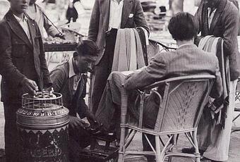 En esta singular estampa que nos transporta al mes de julio de 1934 vemos como un anónimo personaje es rodeado y casi asediado por diferentes vendedores ambulantes, aunque todo sea dicho, la presencia de éstos no parece incomodarle, más bien todo lo contrario por lo que deja entrever su pose relajada.