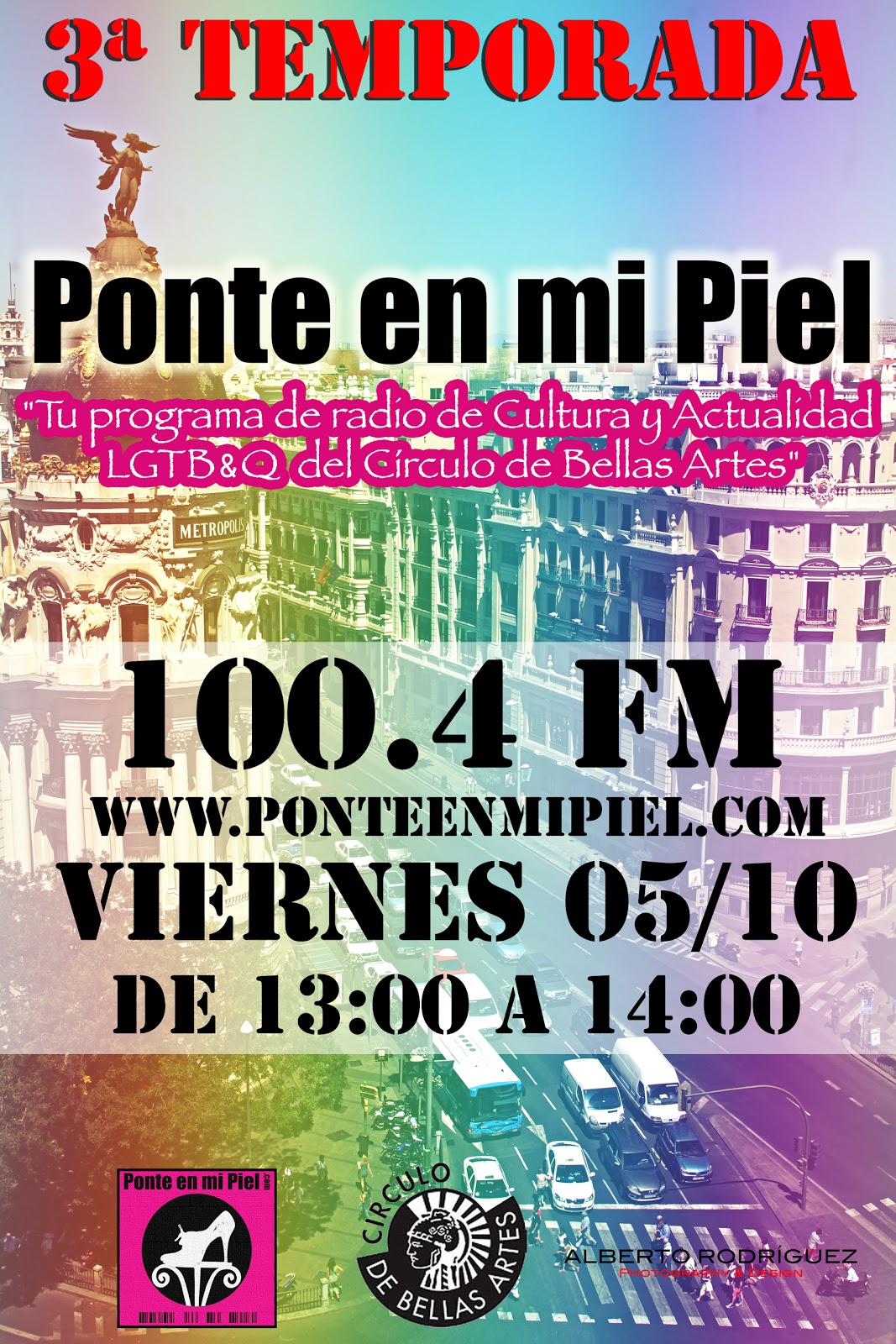 A partir del viernes 5 de octubre, Ponte en mi Piel, el primer programa de radio de Cultura y Actualidad LGTB&Q vuelve a las ondas para reivindicar, a través de la cultura y el arte, los derechos y la visibilidad del colectivo de lesbianas, gays, transexuales, bisexuales y queers.