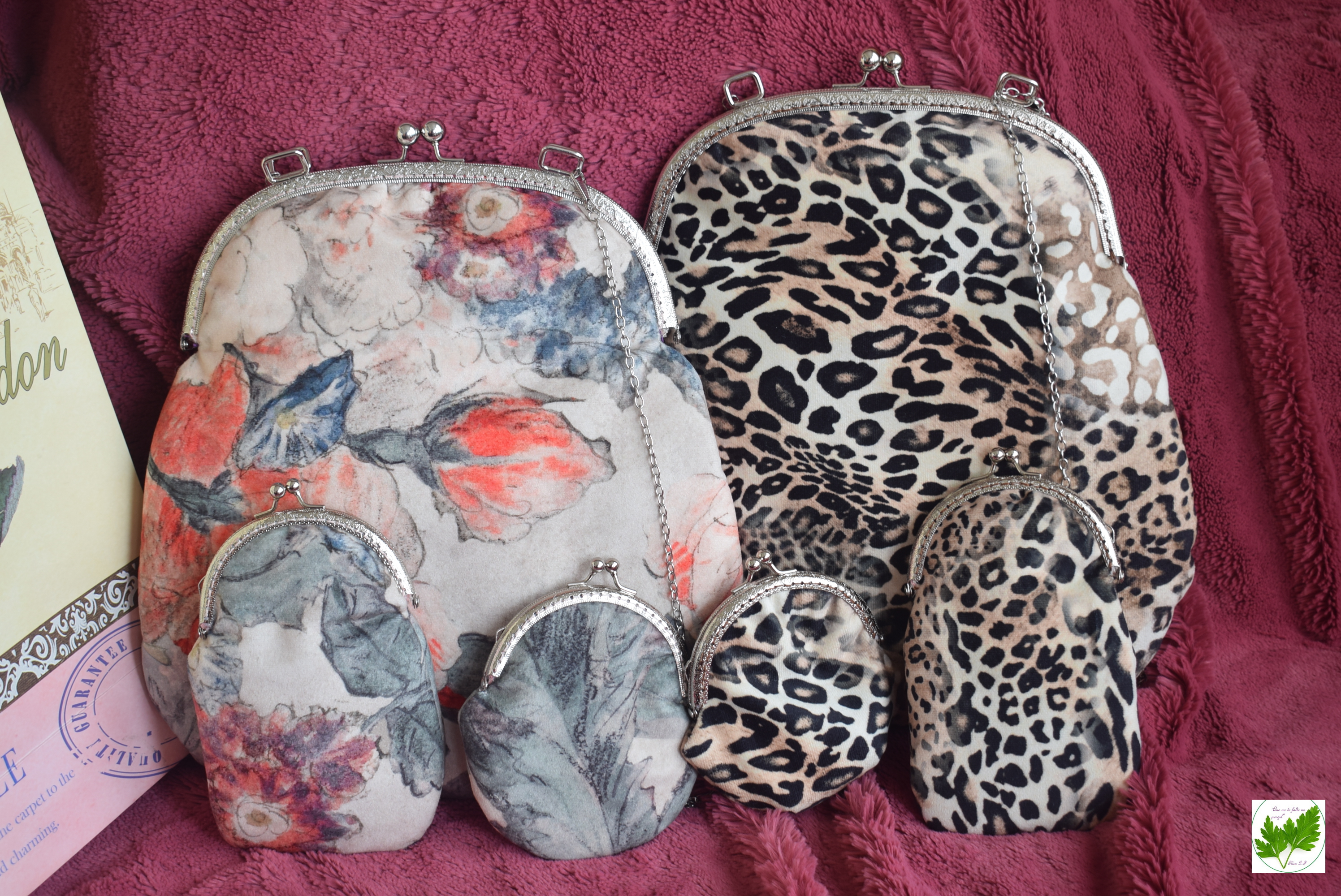 Estos bolsos los confeccioné antes de Navidad y hoy los enseño por si os sirve de idea. Una bonita colección compuesta por un bolso grande con cadena para colgar, bolso para las gafas de sol o de ver y el monedero o bolsito para guardar el pintalabios y espejito. La tela es aterciopelada pero de pelo muy corto, los cierres de boquilla, el interior forrado y rematado con puntilla de encaje dan el toque retro o vintage que está tan de moda.