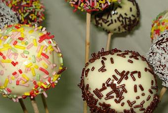 - Sacamos las bolas del congelador, introducimos un palillo por la parte roma en el chocolate y pinchamos con esta parte una bola, mojamos la bola en chocolate, la levantamos, le damos vueltas para que suelte el exceso de chocolate e incluso damos unos golpecitos al palillo para ayudar a que caiga el exceso de chololate. Esto se ve muy bien en el vídeo de Bakerella.