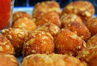 A la hora del servicio, pasamos los popcorn y nuggets primeramente por el rebozado seco, después por el líquido y de nuevo por el seco.
