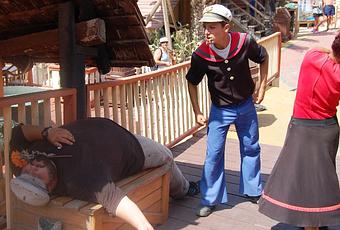 Nada más entrar presenciamos la victoria de Popeye frente a Brutus y el primer beso de su amada Olivia… ¡pobre Brutus, ha caído derrotado después de que Popeye tomara su lata de espinacas! Os lo contamos en directo desde twitter, gracias al wifi gratuito todo el recinto. Continuamos el paseo visitando los decorados de la película: la escuela, el dentista, la panadería, la carpintería… algunos decorados sólo se visitan, otros se han reconvertido en zona de juegos infantiles con minigolf, tiro al blanco, manualidades… el caso es que los visitantes estén entretenidos cada minuto realizando actividades de diversa índole.