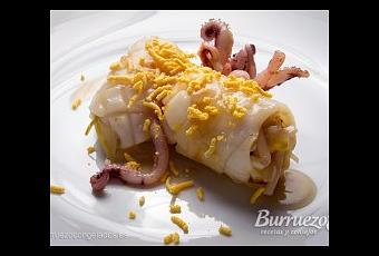 Planchear los trozos de calamar, ligeramente salpimentados, con un poco de aceite, comenzando por su cara exterior, para luego darle la vuelta y planchear por la que hemos rayado. El calamar se rizara, girar para dorarlo por todo su contorno. Dejar atemperar y rellenar los roscos de calamar con el salteado.