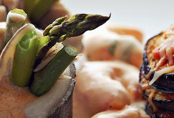 INGREDIENTES:Para las popietas:2 doradas16 espárragos1 paquete de angulas1 ajos.1/2 guindilla.Sal, pimienta.Aceite de oliva.1 vaso de fumet de pescadoPara el Milhojas:1 berenjenaSalsa de tomateQueso ralladoPara la salsa:16 langostinos1 dientes de ajoGuindillaAceite de olivaSalPerejilVino blanco de calidadNataPimentón dulce o picante