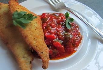 - Doradas limpias y fileteadas.- Huevos y leche.- Pan rallado.- Ajo en polvo.- Estragón seco.- Aceite de oliva.- Sal y pimienta.- Pimientos rojos.- Pimientos verdes.- Tomate natural de lata triturado (o tomates frescos aptos para fritura).- Aceite de oliva.- Azúcar.- Sal.Elaboración: