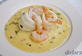 Ingredientes para 4 personas:4 filetes hermosos de lenguado16 langostinos pelados crudosSal, pimienta negra Para la salsa: 1 puerro 1 c/s de harina150 cc. de caldo de pescado 50 cc. de vino blancoPerejilAceite de oliva virgen extraPartir cada filete en dos por la parte central y a lo largo, salpimentar, colocar dos langostinos y enrollar, sujetar con un palillo para que no se abran.