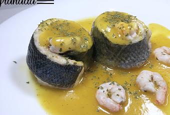 Se ponen en un plato los filetes de Lubina con la piel para abajo y se salpimientan.Se agrega 3 gambas peladas y limpias y se enrollan con cuidado de que queden bien sujetos, ya sea con un palillo como envueltos en film.Se colocan con cuidado en el varoma de que no se abran y se añaden el resto de gambas peladas que tenemos, al gusto.
