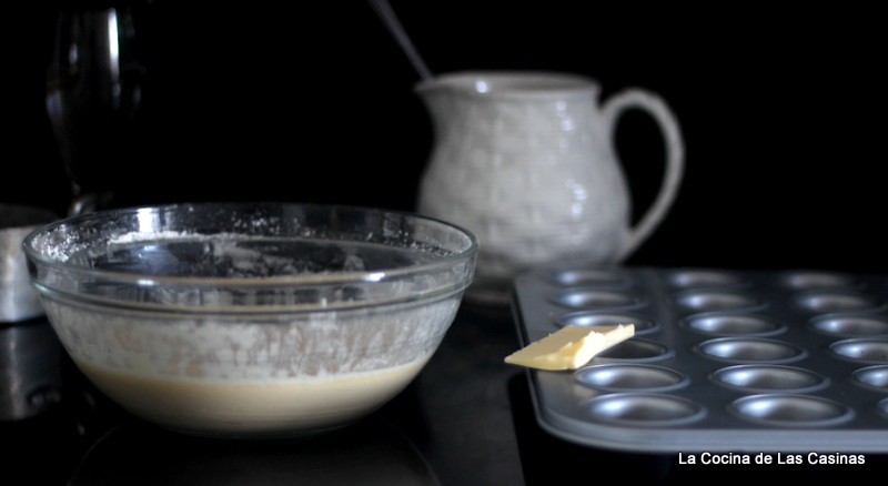 Precalienta el horno a 230º, pon en cada uno de los moldecitos un cuadradito de mantequilla, introduce en el horno 2-3 minutos hasta que se deshaga. Retira del horno y vierte la mezcla en cada uno de los moldecitos hasta casi llenarlos. Introduce en el horno, !!!no lo puedes abrir!!!! durante 20 minutos a 230º y reduce la temperatura a 175º durante 10- 15 minutos. Es una pasada ver como suben.Tiene una textura crujiente por fuera y ya ves que ricurez como quedan por dentro. Una delicia,Espero que te guste, bsss