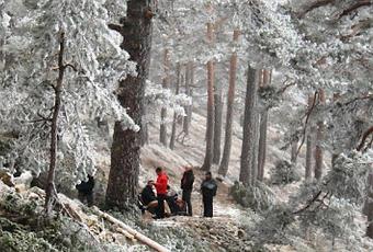 La Senda de Cospes entre la finísima nieve y la cencellada.Finísimos copos de nieve sobre la cabeza libre del montañero. No necesitamos cubrir el cuerpo de este frío de invierno, caminamos entre los pinos con el sosiego musical de las notas que se han posado en las púas y las ramas entre el invisible baile constante de la nieve y la cencellada de esta madrugada.