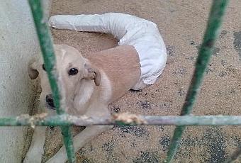 Tiene la tibia rota, le han dado 4 o 5 puntos y se le ha inmovilizado, pero eso no es solucion, hay que operarlo!!!!!