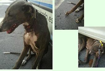 Al fin hemos podido coger al galgo con el cuello destrozado víctima de un ahorcamiento. También tiene la pata destrozada debido a un atropello.