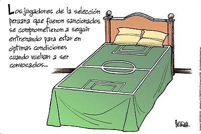 28 años sin que equipo peruano llegue a un mundial , los peruanos hemos tenido que conformarnos (una vez más)con alentar a los países vecinos, que puede sonar muy panamericano, pero el corazón del hincha peruano es hoy una pelota desinflada. Curiosamente los mismos que conspiraron con su ineficiencia, poco cariño a la camiseta, y la incapacidad para planificar son los único s que pudieron escuchar cantar en vivo el Waka-waka. Pero cuando todo está perdido y hasta Dios a veces se pone la camiseta ajena once peruanos han decidido ponerse la camiseta del humor y sudar tinta, así aparece "Por Humor a la Camiseta" una exposición con el tema del mundial de fútbol que demuestra que al menos en el humor para Perú, no todo está perdido.Integran el equipo: En el arco Mario Molina, defensas, Pepe Sanmartín, Julio Carrión "Karry", Víctor Sanjinéz, medio campo Javier Prado, Nebver San Martín, Mechain, en la punta Andrés Edery, Carlos Lavida y Omar Zevallos. DT: Leonardi. (En Homenaje).
