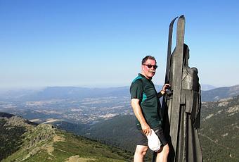 Nos agrupamos en la antigua estación del teleférico. El sol brilla de hermosura, montaña abajo, desde la escultura levantada a la Madonna de los esquiadores.Más suave hasta la Bola del Mundo, los ocho compañeros de esta comitiva de julio llegamos haciendo grupo. Desde aquí dominamos Sierras, cumbres, Gargantas… Desde aquí queremos aprender a controlar nuestras acciones y ser granos de arena en la paz de la tierra. En este punto nos hemos fotografiado muchas veces: en grupos, solitarios, con nieve, con viento, con nuestras compañeras Munia y Pipa, al finalizar la Cuerda Larga, al iniciar una marcha circular…