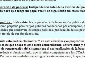 - La democracia parte del pueblo (demos=pueblo; cracia=gobierno) así que el gobierno debe ser del pueblo. Sin embargo, en este país la mayor parte de la clase política ni siquiera nos escucha. Sus funciones deberían ser la de llevar nuestra voz a las instituciones, facilitando la participación política ciudadana mediante cauces directos y procurando el mayor beneficio para el grueso de la sociedad, no la de enriquecerse y medrar a nuestra costa, atendiendo tan sólo a los dictados de los grandes poderes económicos y aferrándose al poder a través de una dictadura partitocrática encabezada por las inamovibles siglas del PPSOE.