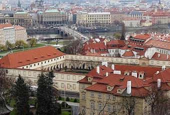 Frente a la puerta principal de LA CATEDRAL DE SAN VITO se inicia un pasaje que te lleva por un par de grandes patios. Al final del pasaje encontrarás a la izquierda la plaza en el que se encuentra el ingreso principal del castillo: son increíbles las dos violentas y robustas esculturas que se ubican sobre las columnas de la entrada.