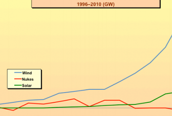 El total acumulado de potencia instalada de fuentes renovables dejó atrás a las nucleares por primera vez en 2010, según el borrador de un nuevo informe que saldrá pronto por el Worldwatch Institute, lnforme del Estado de la Industria Mundial de Energía Nuclear 2010-2011. "En 2010, por primera vez en todo el mundo, la capacidad instalada acumulada de las turbinas de viento, de biomasa y plantas de residuos en energía, y la energía solar llegó a 381 gigavatios, superando la capacidad nuclear instalada de 375 gigavatios," según se cita en el informe..