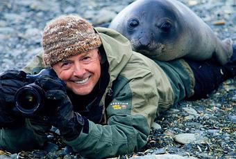 Art Wolfe con un elefante marino que decidió apalancarse sobre él durante el rodaje de " Travels to the Edge "