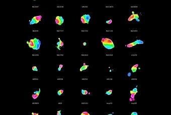 Distribución del gas molecular en 30 fusiones de galaxias. El gas que se aleja de nosotros aparece rojo mientras que el que se aproxima aparece en azul. Los contornos, junto con la transición del rojo al azul, indican un disco gaseoso que está girando sobre el centro de la galaxia. Crédito: ALMA/SMA/CARMA/IRAM/J. Ueda.