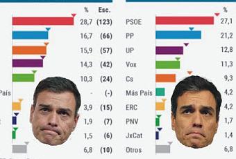 En la misma encuesta de Sigma 2 para El Mundo, ni uno solo de los líderes políticos supera los 4 puntos sobre diez de valoración de líderes. Transmiten todos ellos tal imagen de inoperancia e incapacidad, que el más valorado, con 3.79 puntos, es este presidente Sánchez en funciones de probado falsario currículum y contrastada habilidad para hacer hoy lo que ayer criticaba de otros.