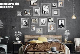 - La pared ha sido pintada con pintura de pizarra, lo que permite escribir sobre ella y lograr resultados tan sorprendentes como la preciosa composición de fotografías sobre el cabecero, con marcos pintados, la imitación de ladrillos vistos, o el florero y la lámpara pintados sobre las mesillas. Es un recurso magnífico para variar el aspecto de la habitación, dándole un ambiente totalmente nuevo, solo con borrar y volver a pintar sobre la pared.
