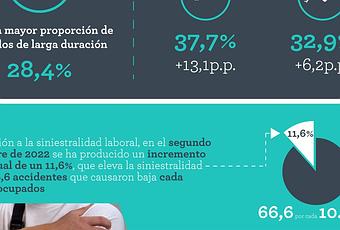 La siniestralidad laboral continúa su tendencia ascendente iniciada en 2014, habiendo dejado atrás la pausa de 2020 como consecuencia de las restricciones a la actividad económica para intentar combatir la pandemia. En el segundo trimestre de 2022 se ha producido un incremento interanual de un 11,6%, que eleva la siniestralidad hasta 66,6 accidentes que causaron baja cada 10.000 ocupados. Es el dato más alto desde marzo de 2020. La siniestralidad laboral lleva cuatro trimestres consecutivos aumentando en todas las comunidades autónomas al mismo tiempo, cosa que no ocurría, al menos, desde el año 2000.