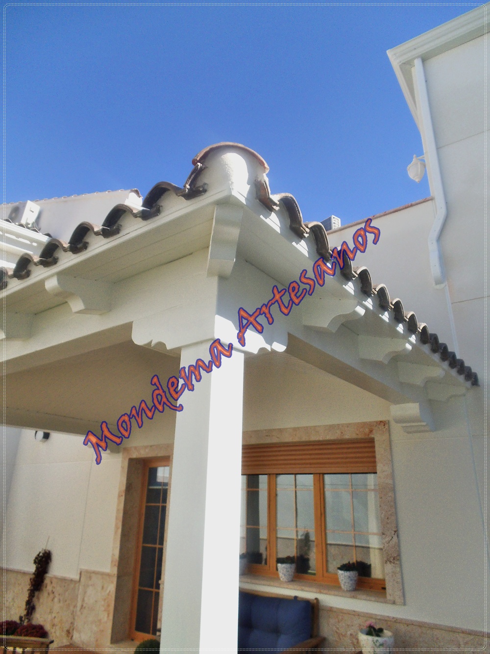 Porche de madera a 3 aguas, con vigas macizas y canecillos, con esmalte en blanco al agua .