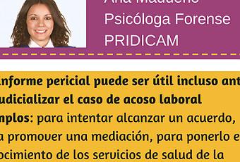 Entrevista: Ana MadueñoPsicóloga Forense PRIDICAMLicenciada en Psicología por la Universidad Complutense de MadridMáster en Atención temprana, ITEAPMagister en Psicología clínica, legal y forense, Universidad Complutense de Madrid¿Porque es útil una pericia psicológica para un afectado de acoso laboral?Un informe pericial puede ser útil antes de judicializar el caso. Por ejemplo:· Para intentar alcanzar un acuerdo· Para promover una mediación· Para ponerlo en conocimiento de los servicios de salud de la empresa· Para presentarlo ante la inspección de trabajoUna vez que se decide llevar el caso a los tribunales, el informe pericial puede resultar de gran ayuda para el abogado a la hora de plantear la demanda correspondiente.¿Qué relación puede tener la psicología forense con el mobbing o acoso laboral?Las áreas de la actividad práctica de los psicólogos forenses resulta muy amplia, encontrándonos en la misma desde disputas sobre guardia y custodia, evaluación de la criminalidad o evaluación del perfil psicológico de delincuentes entre otros. La valoración pericial del acoso psicológico en el lugar de trabajo sería una de las áreas donde la psicología forense puede aportar conocimientos técnicos muy relevantes (por ejemplo estrés laboral, prevención de riesgos laborales…)El mobbing se define como una forma característica de estrés laboral que presenta la particularidad de que no ocurre exclusivamente por causas directamente relacionadas con el trabajo o con su organización, sino que tiene su origen en las relaciones interpersonales que se establecen en cualquier organización entre los distintos individuos (Martín-Daza et al, 1998). La psicología forense tendría el objetivo del análisis psicológico debiendo establecer una relación de causalidad, puesto que cada vez resulta más frecuente que los supuestos de mobbing alcancen la Administración de Justicia, por lo que resulta fundamental la labor del psicólogo forense como asesor técnico y cualificado sobre la material (González-Trijueque,2007b)