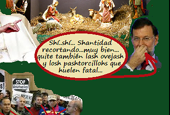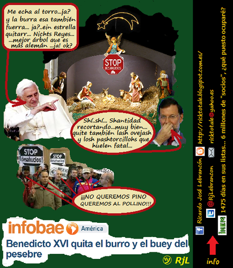 Pues eso, que nuestro Papa Benedicto XVI, Ratzinger para sus familiares consanguíneos, obrando como padre que es (Santo, pero padre al fin y al cabo) le ha dado por cargarse de un plumazo o boligrafazo, depende con lo que escriba, (y supongo que tras una mala noche de insomnio) a la burra, el buey, la Estrella de Belén, conejos, gallinas... los Reyes Magos ahí están, pero tente mientras cobro: que si no eran tres, que si no había uno negro, que si no seguían la Estrella o la supernova o lo que fuera (no lo tiene muy claro). Vamos, que para la próxima: ¡Agur, Majestades!. Pastorcillos y ovejas debieron brillar pero por su ausencia: "No había animales" asegura, por tanto tampoco habría quién los cuidara si los hubiera... Del ángel, ese querubín rubio apelirrojado y resalado colgado a la entrada, me parece que no dice nada... se le habrá pasado; cosas de la edad. Total, que nos ha dejado el "Nacimiento" de churro. Y no se lo pierdan, que quizás en un futuro ni eso; porque sin negar del todo a San Lucas y a San Mateo les contradice (ay, esas traducciones de los Textos) y nos afirma que Jesús no nació cuando hasta ahora se nos había hecho creer por parte de otros "infalibles Papas", sino unos años antes y coincidiendo con una conjunción de los planetas Júpiter, Saturno y Marte... Qué, ¿cómo se les ha quedado el body?. No quiero ser agorero, pero vayan preparándose: otra noche en vela y unos cálices de moscatel (perdón, Sangre de Cristo) y le prende fuego al pesebre. Ya saben: "¡¡porque lo digo yo y basta!!"