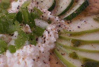 Ingredientes: Un tomate maduro sin piel ni semillas, un trozo de pepino, un trozo pequeño de cebolla blanca dulce, un pimiento verde, una manzana granny Smith, vinagra de vino, aceite de oliva virgen extra (uso actualmente de Riogordo, malagueño), una rebanada de pan, albahaca fresca, queso fresco de cabra (malagueño a ser posible), pimienta negra y sal.