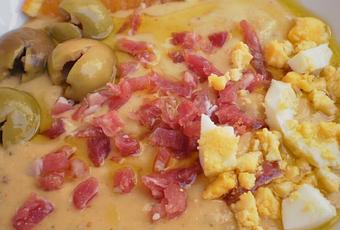 Poner en un plato, decorar con la naranja, el jamón, el huevo duro, las aceitunas y por último echar unas gotitas de aceite de oliva…..
