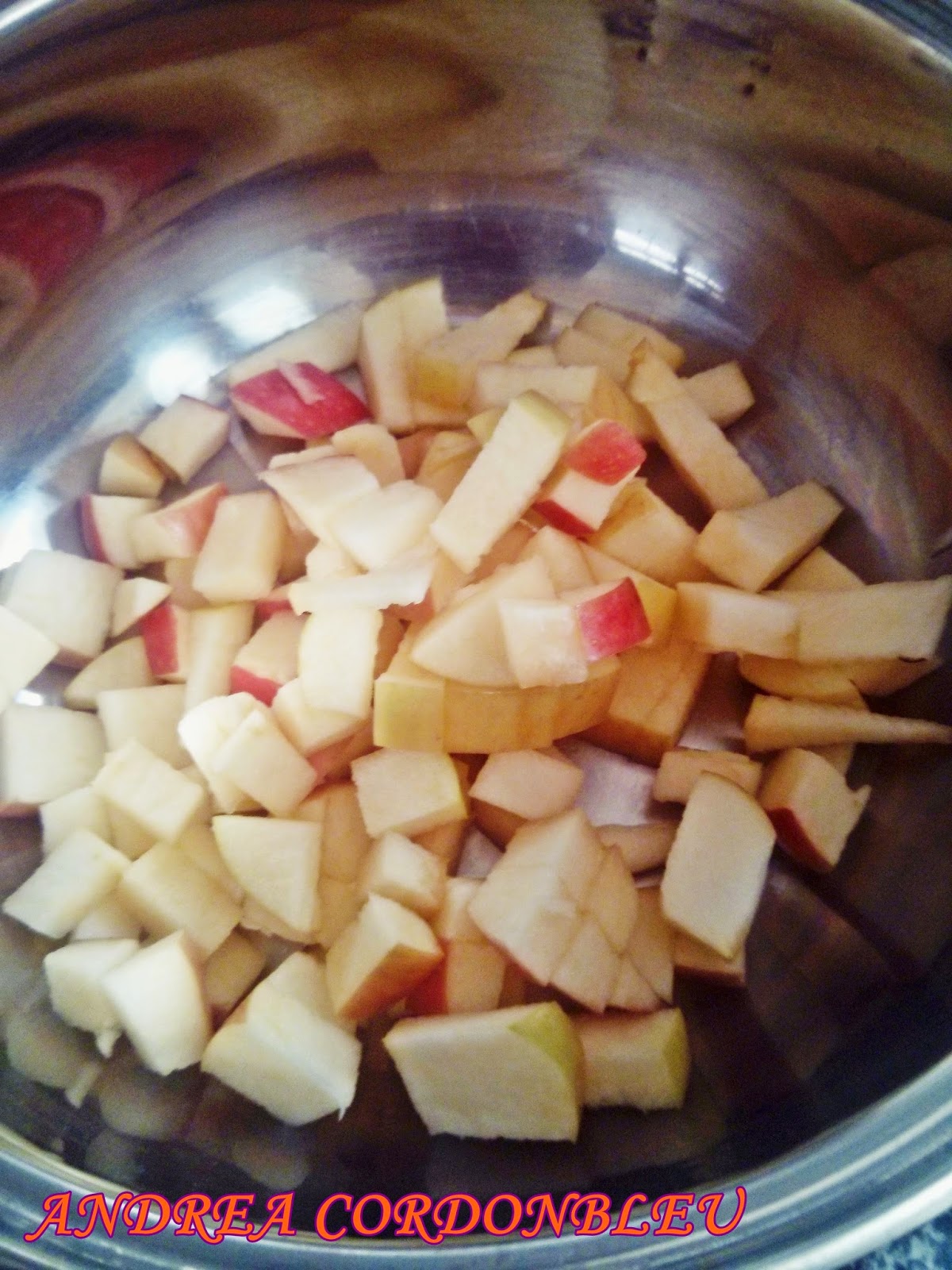 Se lava la manzana. Se le quita el corazón. A mi no me gusta pelarla. Se corta en cuadraditos.