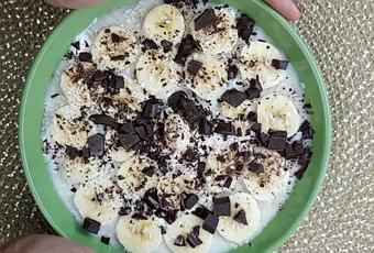 Porridge de choco blanco y coco con cottage, plátano y chocolate