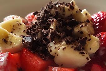 Luego remueve, y toma tibio o frio. Yo lo acompañé con fresones y plátano, un hilito de leche condensada y chocolate rallado.