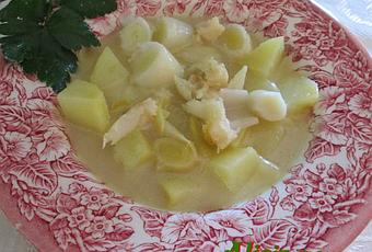 - Puerros 3 (solo la parte blanca).- Patatas 2 (medianas).- Bacalao (desalado) 3 ó 4 trozos.- Aceite de oliva 4 cdas.- Sal.