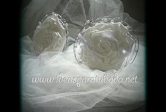 ¿Qué tal? Nosotros preparando las Bodas de Primavera y de Verano y también las Comuniones. Comenzamos el lunes de Semana Santa con un precioso conjunto de Porta Alianzas y Porta Arras con el tallo en color plata y la flor en color blanco. Los detalles del lazo y las perlas decorativas del bouquet son en blanco a juego con la flor.