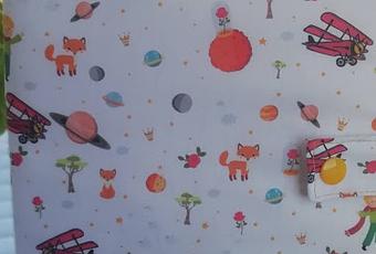 Este primero es para Adrián. Compré la tela de El Principito en la Algodonera Platero, y opté por combinarla con amarillo en el bies, el nombre, el snap, la cinta de raso y el interior. Ha quedado alegre y a la vez muy dulce con esa versión tan bonita del personaje de Saint-Exupéry.