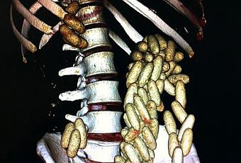Varón de 45 años que acudió a urgencias por dolor abdominal y hematoquecia desde hacía 24 horas. Presentaba un abdomen distendido, timpánico, con defensa a la palpación de forma difusa y peristaltismo conservado. En el tacto rectal se palpó masa no dolorosa y móvil, así como restos de sangre roja al retirar el dedil. Se solicitó analítica de sangre con hemograma, bioquímica, coagulación, radiografía de tórax y tomografía computarizada de abdomen, destacando una leucocitosis con neutrofilia, y en abundantes cuerpos extraños radioopacos en íleon y marco cólico hasta ampolla rectal . Pasó a sala de observación de urgencias donde le fue administrado laxante osmótico por vía oral (polietilenglicol) a altas dosis, expulsando por vía rectal 110 cápsulas de 4 x 1cm (Figura 2).