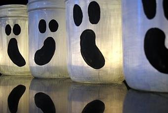 Para realizarlos solamente tenemos que pintar los frascos de vidrio rebajando el acrílico o el látex con un poco de agua para dar transparencia a los portavelas, recortar en la cartulina los ojos y la boca de los fantasmas y pegarlos una vez que ya esté seca la pintura. Introducimos las velas dentro y ya tenemos unos graciosos fantasmas que iluminarán cualquier estancia mientras se preparan para disfrutar de su gran noche.
