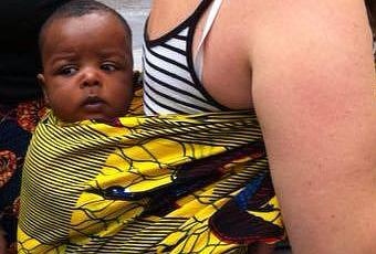 Estaba con mi chico mirando como la gente aplastaba con los pies la uva para hacer vino (seguro eso tiene un nombre que la guiri aquí no tiene ni idea cual es) hoy en la plaza del pueblo donde vivo, cuando mire hacia mi izquierda y vi una pareja con su bebe colgado a la espalda. Nudo con el paño africano, uno de mis desconocidos portabebes.